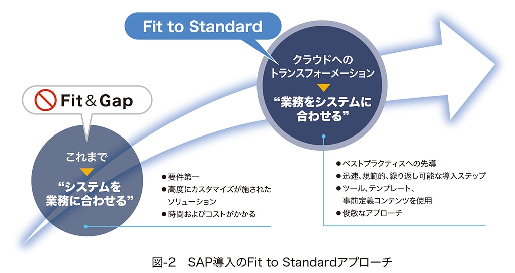 このように次世代の基幹系システムにおいては、作りこみによって個社独自のシステムを作り上げるのではなく、システムの標準に合わせ、デジタル技術の長所を適切に活用していくことが企業にとって最善の選択となります。そして、Fit to Standardに基づいたDX基盤の実現に有効なのがSAP S/4HANA Cloudです。グローバル標準のベストプラクティスを具体化した標準機能によって、企業の基幹業務を支えることが可能です。(図-2)