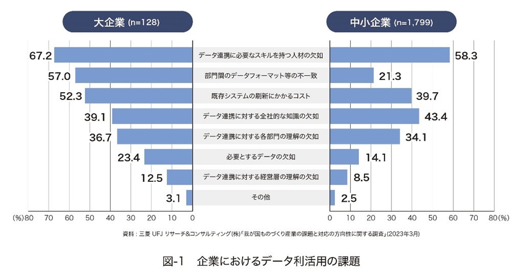 データの連携、利活用を行ううえで、企業はどのような課題を抱えているのでしょうか。ものづくり白書(2023年版)では下図のデータが提示されています。データ利活用への課題としては、データフォーマットの不一致やデータ連携に対する知識や理解の欠如といったシステム面の課題が上位に挙がっています。