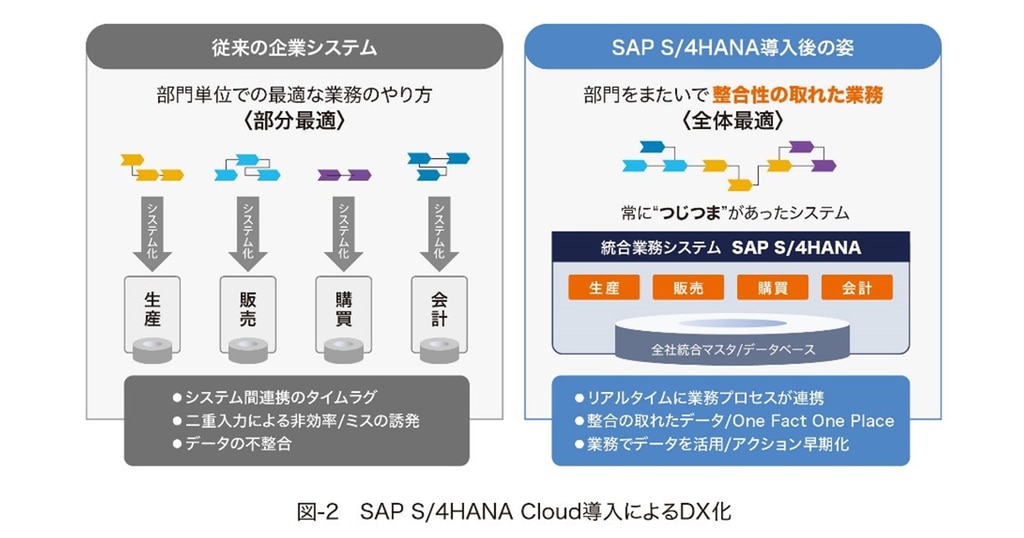 これらの課題のなかで、システム起因である問題の多くは、SAP S/4HANA Cloudの導入によるDX基盤の構築によって解決できます。部門をまたいで整合性のとれた業務、全体最適のシステムを実現することにより、全社統合されたマスタ/データベースのもとで整合性のとれたデータを活用できるようになります。