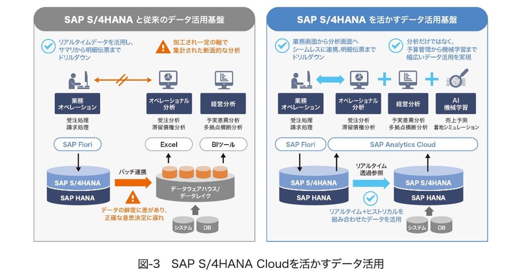 基幹系DX基盤としてのSAP S/4HANA Cloudとともに、DXの効果をより高め、リアルタイムなデータドリブン経営を可能とするSAP Datasphere、SAP Analytics Cloudを活用することがDX時代に最も適したITシステムとなります。