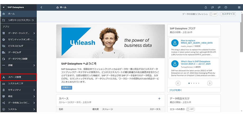 Datasphereでは、データの取得、モデリングなどの作業はすべてスペース内で行われます。