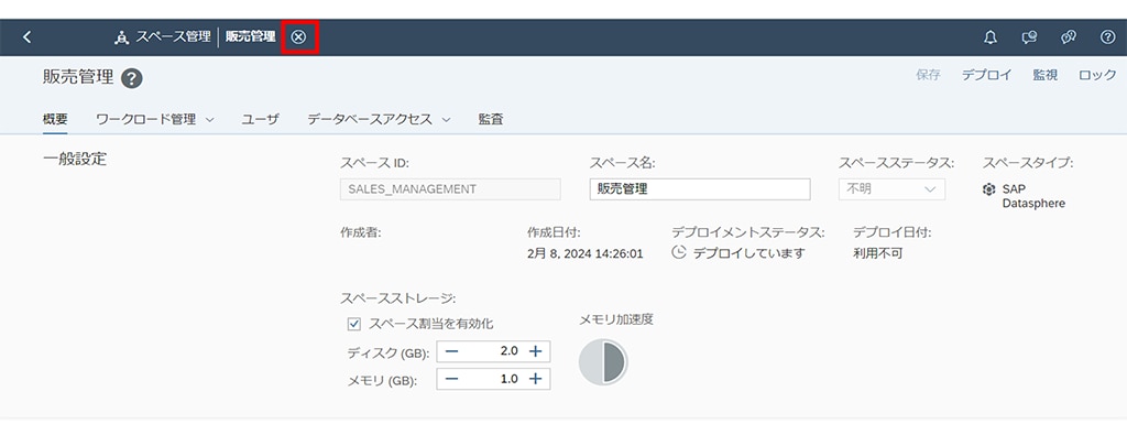 Datasphere内でスペースに割り当てるディスクストレージやメモリストレージの割当量が指定できます。設定を変更しない場合、そのまま閉じてしまって問題ありません。