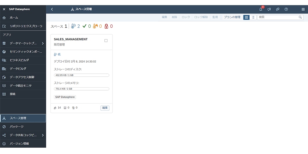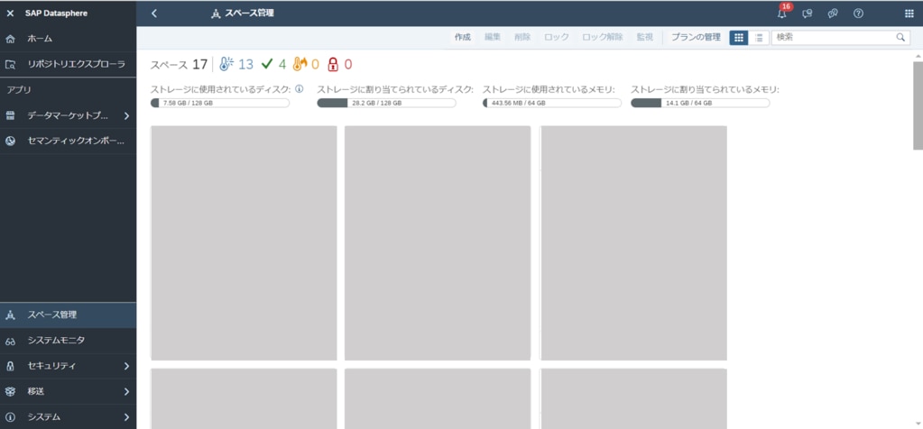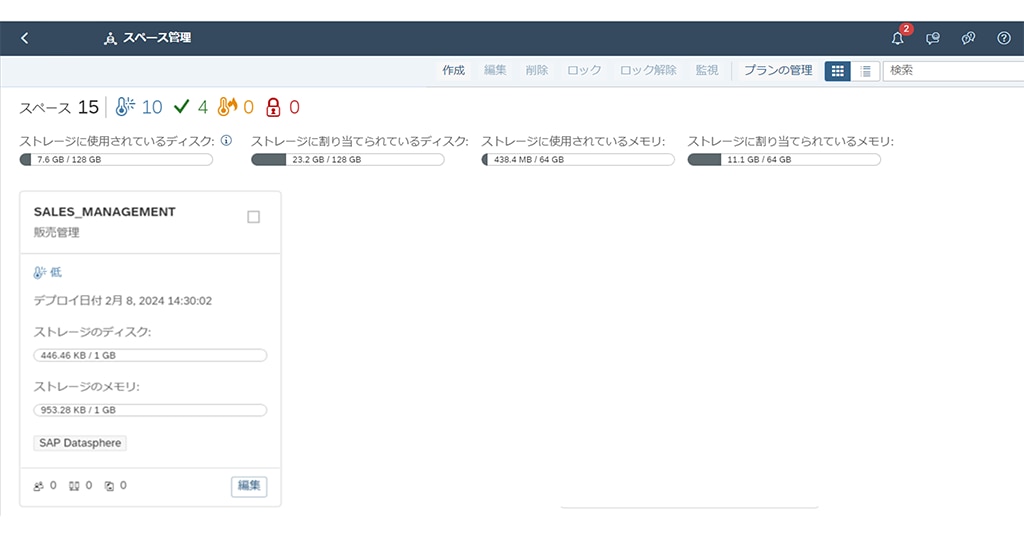 「スペース管理」の画面では、Datasphereにあるすべてのスペースに対して操作を行うことができます。