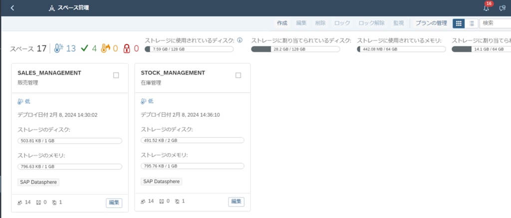 以上の手順を実施することで、Datasphere上に「販売管理」と「在庫管理」という2つのスペースを作成しました。