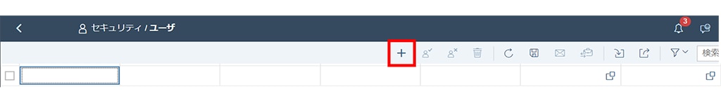 セキュリティ/ユーザの画面に遷移後、右上にある「+」ボタンをクリックすると、新規ユーザの情報を追加する列が作成されます。