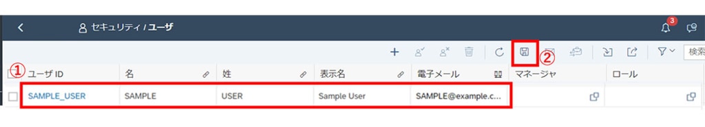 新規で追加するユーザの「ユーザID」、「名」、「姓」、「表示名」、「電子メール」を入力します。右上の保存ボタンをクリックし、内容を保存します。