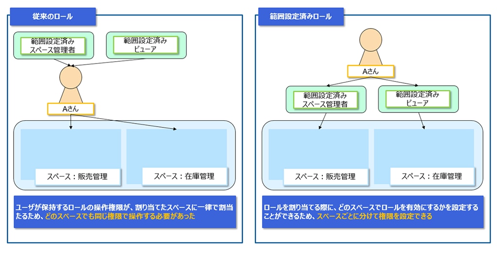 2023年10月末に導入された、「範囲設定済みロール(Scoped Roles)」により、スペースごとにロールを割り当てることが可能です。