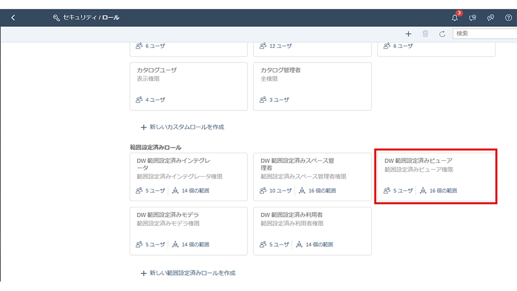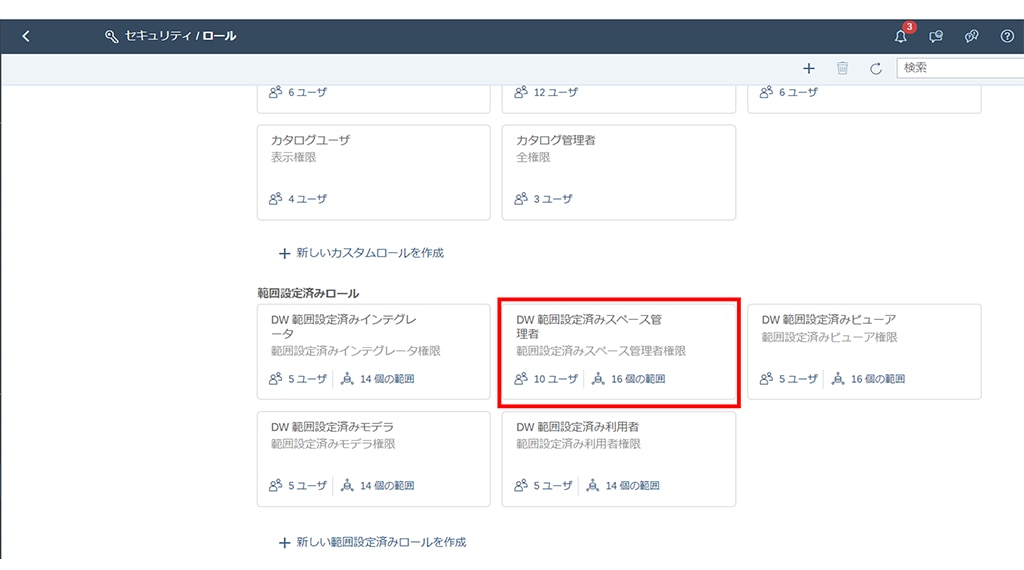 ①「セキュリティ/ロール」から「DW範囲設定済みスペース管理者」をクリック