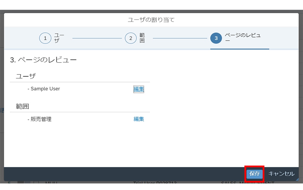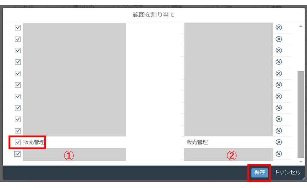 「範囲を割り当て」というポップアップが立ち上がります。「販売管理」スペースのチェックボックスにチェックを入れて「保存」をクリックし、変更内容を保存します。
