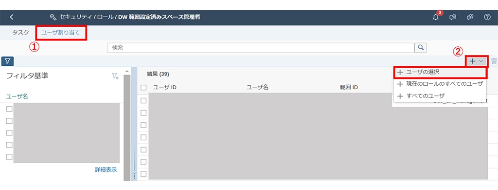 先ほど作成したユーザにDW範囲設定済みスペース管理者の権限を割り当てます。「ユーザ割り当て」をクリック後、「+」ボタンをクリックするとタブが開きます。タブ内の「ユーザの選択」をクリックします。
