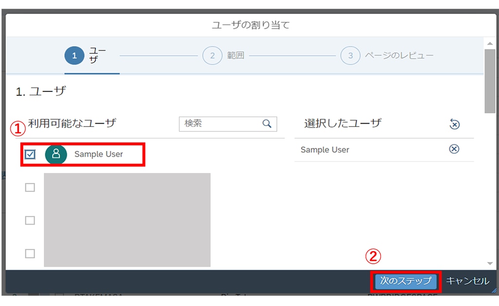 「ユーザの割り当て」というポップアップが立ち上がり、利用可能なユーザの欄から先ほど作成したユーザを探します。指定のユーザを選択し、チェックボックスにチェックをいれ「次のステップ」をクリックします。