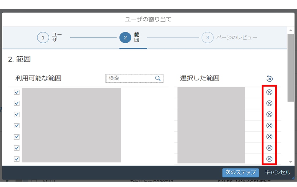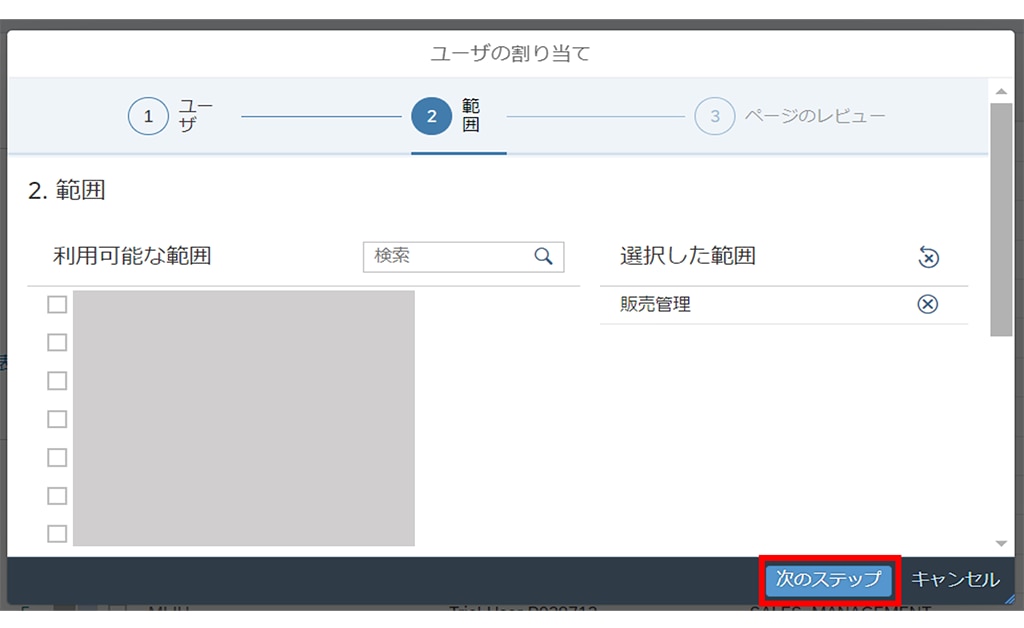 今回はユーザの権限は、「販売管理」のスペースのみで有効になるように設定します。そのため、「選択した範囲」の欄が「販売管理」のみになるよう「次のステップ」をクリックします。