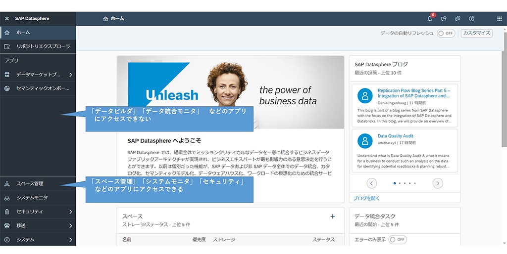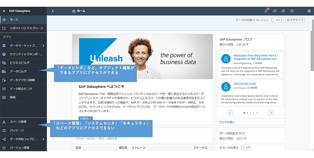 「DW管理者」はDatasphereテナント全体の管理権限であり、Datasphereにおけるユーザ管理、スペース作成などを実行できます。ただし、オブジェクト編集・参照の権限はなく、「データビルダ」などの一部アプリにアクセスできません。